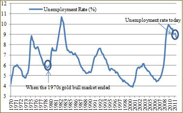 In the 70s, the U.S. economy was in a better shape than today. At the end of the 70s (nearing the end of the bull market in gold), the employment picture was quite healthy.
