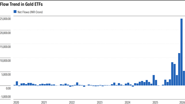The flows into Gold ETFs jumped sharply during FY2026. While the segment received net inflows of INR 149 billion in FY2025, it received a net inflow of INR 666 billion until Feb in FY2026.