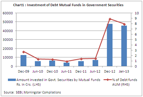 Recently in 2013, some moderation in exposure seems to be underway, although it may be still early to establish if this trend will continue. The total investments of all debt mutual funds in government securities fell from Rs. 47,699 crores in the month of December 2012 to Rs. 45,712 crores in the month of January 2013, as per last available data from SEBI.