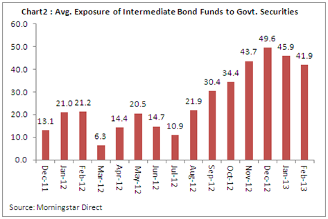 Meanwhile, as per Morningstar data the average exposure of intermediate bond funds to government securities moderated from 49.6% in the month of December 2012 to 41.9% in the month of February 2012.