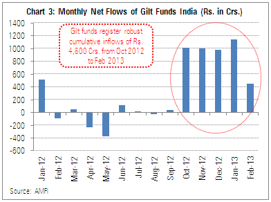 From October 2012 to February 2013, gilt funds registered a cumulative net inflow of Rs. 4,600 crores. The assets of gilt funds have also grown by 145%--from Rs. 3,356 crores at the end of September 2012 to Rs. 8,238 crores at the end of February 2013. Gilt funds constitute a small part of the overall assets of the fund industry (only about 1%), but the inflows into these funds lately does point to an increased appetite for such funds from investors.