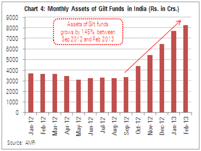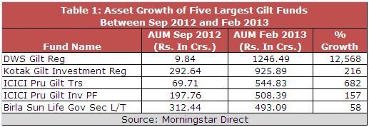 Individual gilt funds have also seen robust growth in assets since the month of September 2012. Table 1 below highlights the growth of assets between September 2012 and February 2013, of the five largest gilt funds (as of February 2013).