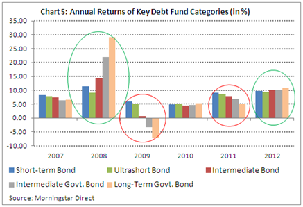 Over the past year (ended February 2013), the long-term government bond fund category has been the top performing category within the fixed income space—delivering an average return of more than 10%. The higher duration of these funds helped them to capitalize on the downtrend in interest rates over the past year. Chart 5 below highlights the annual returns of some key debt fund categories. In 2008, when the RBI cut rates sharply after the Lehman crisis, gilt funds (both long-term and intermediate) outperformed by a significant margin. Intermediate govt. bond funds delivered an average return of 22%, while long-term govt. bond funds delivered an average return of 29% during the year. Similarly, with interest rates softening in 2012, both long-term and intermediate govt. bond funds outperformed.