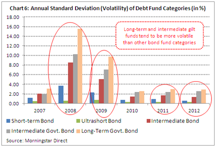 However, during the year 2009, when interest rates hardened significantly, both intermediate and long-term gilt funds posted negative returns during the year. In 2011 as well, with interest rates hardening, gilt funds underperformed short-term and ultrashort bond funds by a decent margin. Therefore, investors should be cognizant of the interest rate risk that gilt funds bear. Chart 6 highlights the annual standard deviation (a measure of volatility) of various debt fund categories. It can be seen that both long-term and intermediate gilt funds tend to be more volatile than other debt fund categories. This is primarily because gilts are more sensitive to interest rate movement and the volatility spikes especially when there is any sharp movement in interest rates.