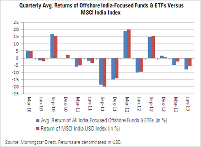We released the June 2013 quarter-end edition of Morningstar Offshore India Fund Spy. The full report is available to subscribers of Morningstar Direct. Here are some key takeaways from the report.