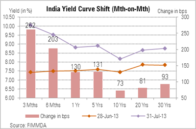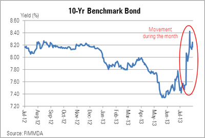 It was a month of carnage in the Indian fixed income markets, as the RBI took several steps to suck out liquidity from the system, in its efforts to curb volatility in the Indian rupee. The yield of the new 10 year benchmark government bond (7.16% GOI 2023) finally closed the month at 8.17%--up 73 basis points (bps) from previous month’s close. The benchmark yield is up by more than a percentage point from a low of 7.11% it hit on May 24. At one point in July, the 10 year yield had climbed to level of around 8.5%, but later subsided.