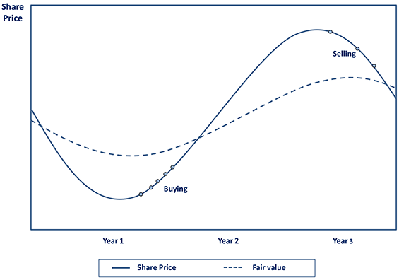 As can be seen from the diagram below, "fair value" is illustrated as a dotted line and the actual share price for a stock is the solid line. Stock prices should actually mimic the underlying fair value for stock earnings.