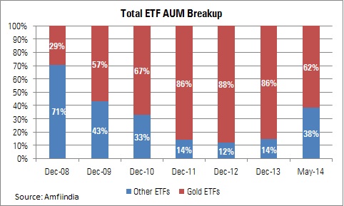 The meteoric rise in the price of gold from 2005 onwards resulted in investors flocking to Gold ETFs. In fact, between 2002 and 2012, the price of gold surged around 400% over that decade. But the bull run in gold lost steam last year prompting investors to redeem their investments in Gold ETFs. Between June 2013 and May 2014, the Gold ETF category witnessed a 27% drop in assets.