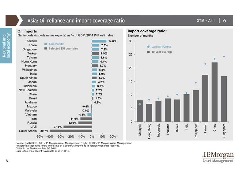 The left shows respective oil reliance, giving us an indication of countries that are likely to benefit or suffer from oil price changes. Low oil prices should benefit importers more than exporters.