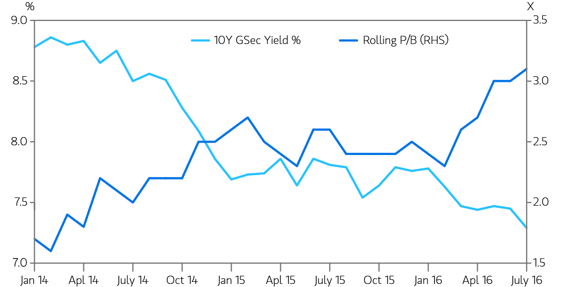 To add, from the beginning of 2014, the yield on 10-year government bonds, a rough proxy for wholesale borrowing costs of NBFCs, has come down by about 150bps. These factors led to an almost 100% rerating in NBFC valuations since early 2014, as measured by one-year forward estimated price to book.