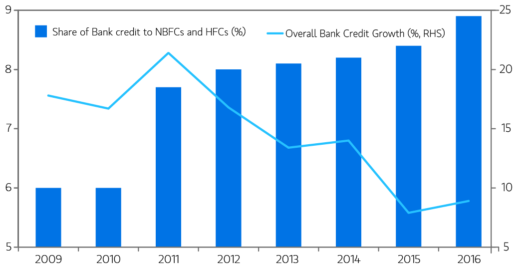 The outperformance of NBFCs has coincided with a period of rising stress in the corporate loan books of most state-owned and some private sector banks that were focussed on project finance. Arguably, these ‘corporate’ banks have been preoccupied with recognition and resolution of these nonperforming loans and have left an open space for NBFCs and consumer-focussed private sector banks to grab share. Moreover, these banks seem to be more than willing to fund these NBFCs, either to meet priority sector lending norms or merely because its ‘lazy banking’. Since the global financial crisis, the share of bank credit to NBFCs (including housing finance companies) has risen by 50% from 6% to 9%.