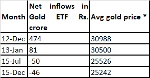 As can be seen, in December 2012 and January 2013, when the gold prices were in the Rs. 30,000 range, the investors were buying units of Gold ETFs. However, in July 2015 and December 2015, there were net redemptions when the gold prices had come down to the lows of Rs. 25,000. What this means is that investors were buying gold at high prices and selling it at lower prices.