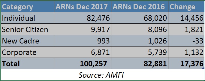 From 82,881 in December 2016, the total distribution force has gone up to 100,257 in December 2017. Distributors in the ‘individual’ category have contributed the most to this growth. The individual ARN licenses have gone up from 68,020 to 82,476 during the same period. Licenses in other categories like ‘senior citizen’ and ‘corporate’ have collectively increased by 2,953.