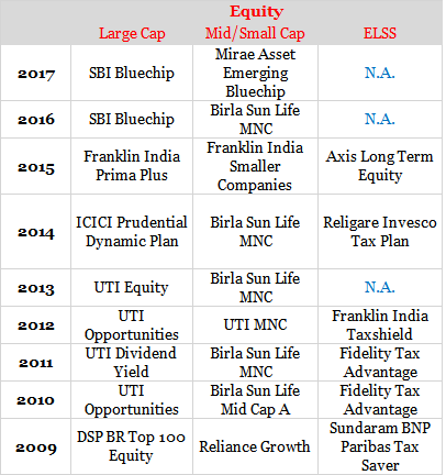 Where the best equity funds are concerned, what stands out is the frequency with which Birla Sun Life MNC has appeared. Funds from UTI Mutual Fund were prominent a few years ago, while Franklin India dominated in 2015.