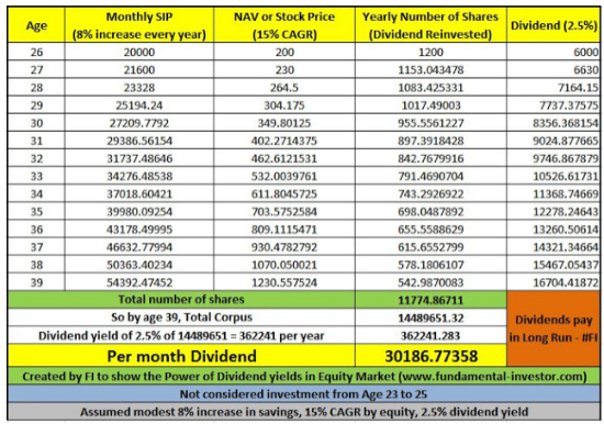 Take the case of an investor who starts at the age of 26. She increases her systematic investment at the rate of 8% per annum. And I am assuming a 15% CAGR with a 2.5% dividend yield. Now grasp the power of dividend compounding.