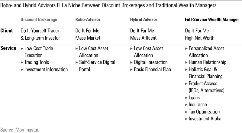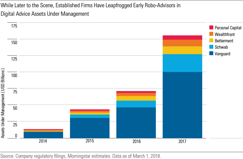 We took the opposite viewpoint in a 2015 report called Hungry Robo-Advisers Are Eyeing Wealth Management Assets.” At the time, we asserted that established financial institutions with economic moats, such as Charles Schwab and Morgan Stanley, would stay competitive. And we found that the stand-alone robo-advisers would “have to invest heavily in advertising, or consolidate to gain scale, be acquired or partner with established brokerages, or go out of business."