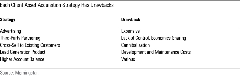 Four strategies can help reduce robo-adviser costs of client acquisition, but each approach has drawbacks.