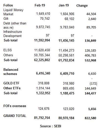 Overall, industry’s folio base has doubled from 4.03 crore in December 2014 to 8.17 crore in February 2019.