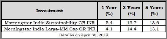 In the Indian context, Morningstar India Sustainability index, a broad and diversified portfolio of Indian companies which target top half of Indian market by market cap out-performed on a 1-year and 5-year basis.