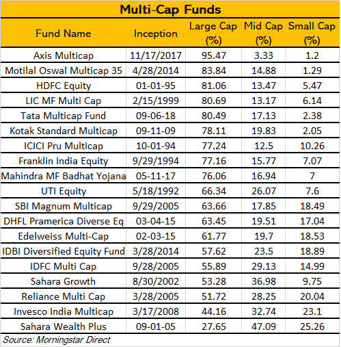 It is important to make note that the multi-cap category consists of quite a few funds that have never (and in all probability will not in the future) go below 75-80% allocation towards large caps. On the other hand, it also includes funds that have a 50% allocation towards large caps and the rest in Mid and small caps. As a result, it becomes important to use some discretion while comparing funds within this category.