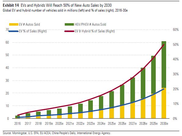 A recent report authored by Morningstar’s Equity Analyst Seth Goldstein, CFA Chair, Electric Vehicle Committee, shows how investors can benefit from increasing EV adoption globally. By 2030, the report forecasts that half of all new auto sales globally will be electrified in some form. Using our regional build up model, we forecast EVs and hybrids will reach 20% and 30% global penetration rates, respectively, by 2030. As shown in the iamge below, 2025 is set to be the inflection point when both EVs and hybrids begin to gain greater share each year as EVs will reach cost and functional parity with EVs in China, the EU, and parts of the U.S., which together represent over 60% of annual global auto sales.