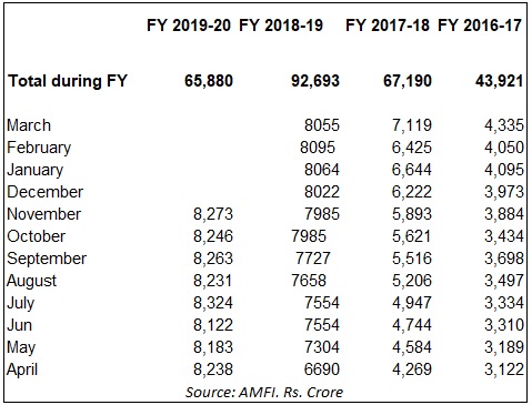 During April-November 2019, the industry collected Rs 65,880 crore through SIPs. In FY 18-19, SIP collections stood at Rs 92,693 crore.