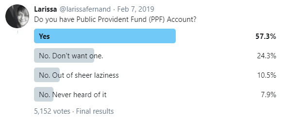 Last year, I conducted a Twitter poll and was pleasantly surprised with the response. But the outcome took me aback. I was unaware as to how many did not have a Public Provident Fund (PPF) account. If you don't, I suggest you read How to get the best out of a PPF account.