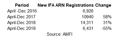 New Independent Financial Advisers (IFA) ARN registrations have dropped by 55% from 14,311 during April-December 2018 to 6,431 in April-December 2019.