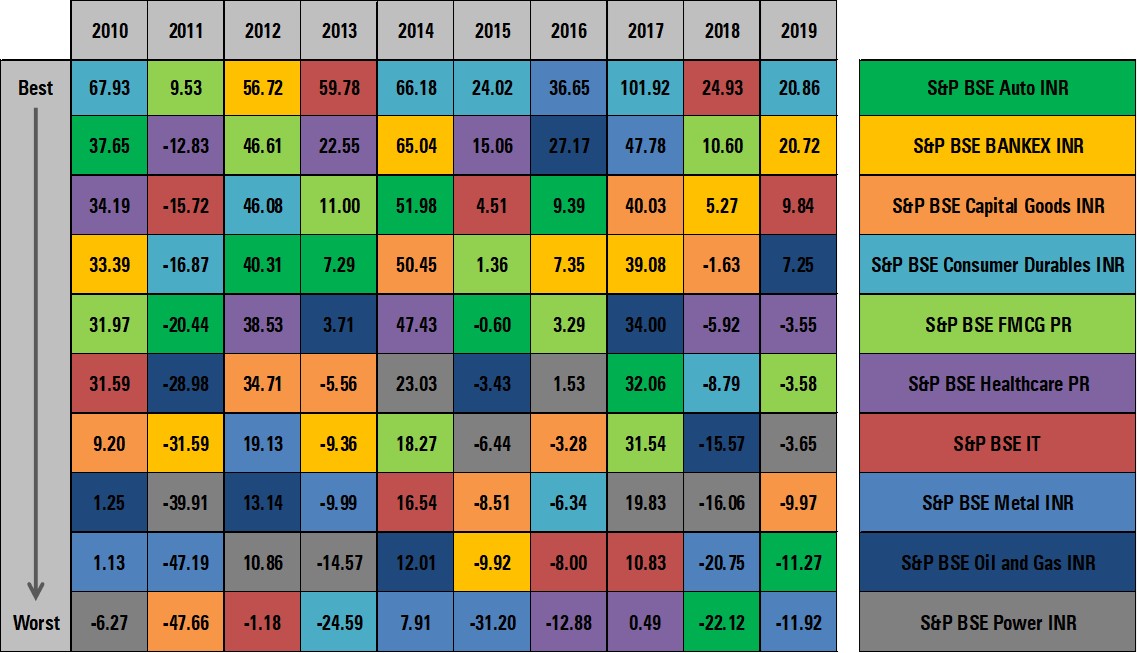 This table shows the calendar year returns of different sectors from 2010 to 2019. In 2010, the best performing sector was Consumer Durables which delivered 67.93% return. In 2011, when all indices were in red, only FMCG sector stood out by delivering 9.53% return. In 2012, BSE Bankex was the top performer, yielding 56.72% return. In the same year, IT Sector delivered - 1.18% return. In 2013, the IT sector bounced back and posted the highest return among all sectors at 59.78%. This clearly indicates that the winners rotate. No single sector delivers consistently every year. Thus, investing in sector funds is akin to timing the market by taking tactical calls. The tactical call may play out as per your expectation, but the returns may not be positive or consistent every year.
