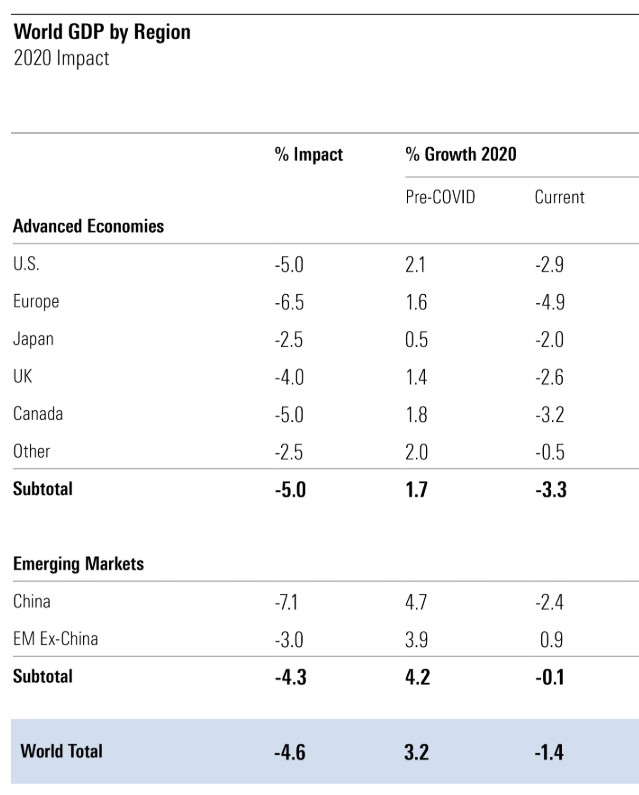 - 9% contraction in U.S. GDP in 2020, but anticipate that the scope of the shutdown to disrupt the economy in the long term is likely overrated.