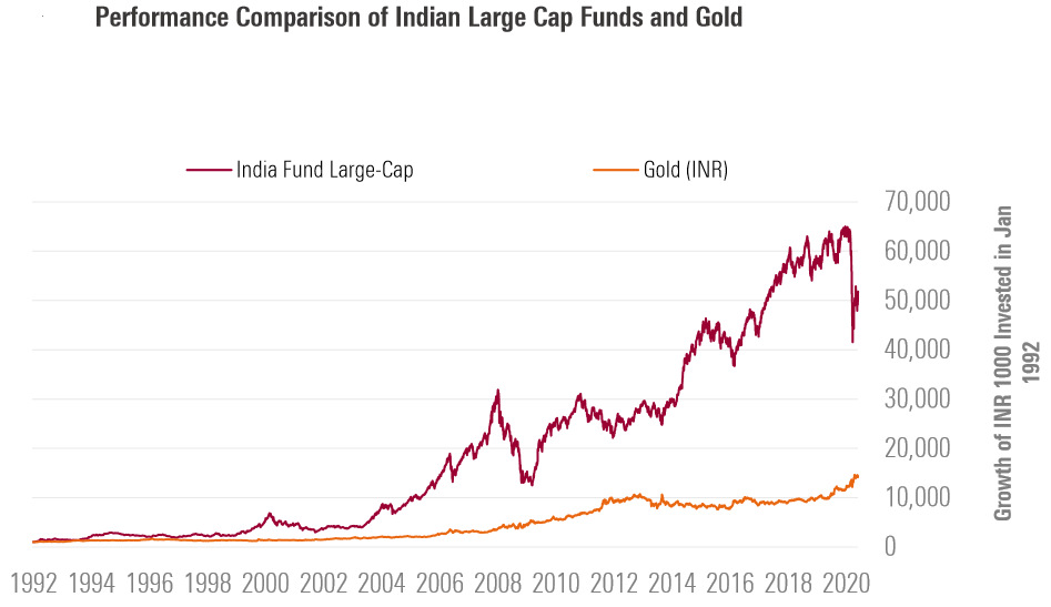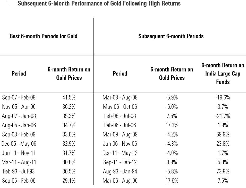 Gold gave positive returns only four out of ten times in the subsequent 6-month period. On the other hand, Indian large-cap funds outperformed gold six out of ten times in the subsequent 6-month periods. Had investors exited large-cap funds at the end of February 2008 only to invest in gold, they would have missed the rebound of 70% return provided by large-cap funds between March 2008 and August 2009.