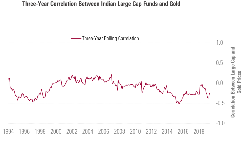 The image below illustrates the correlation between Indian large-cap equity funds and gold over the last 30 years on a 3-year rolling basis.