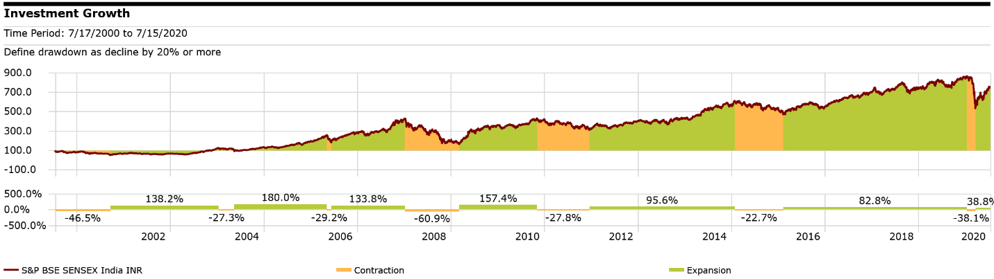 Over the last 20 years, there have been multiple occasions where the market fell more than 20% from the peak and could have taken some time to recover. Over the longer term, returns have been reasonable.