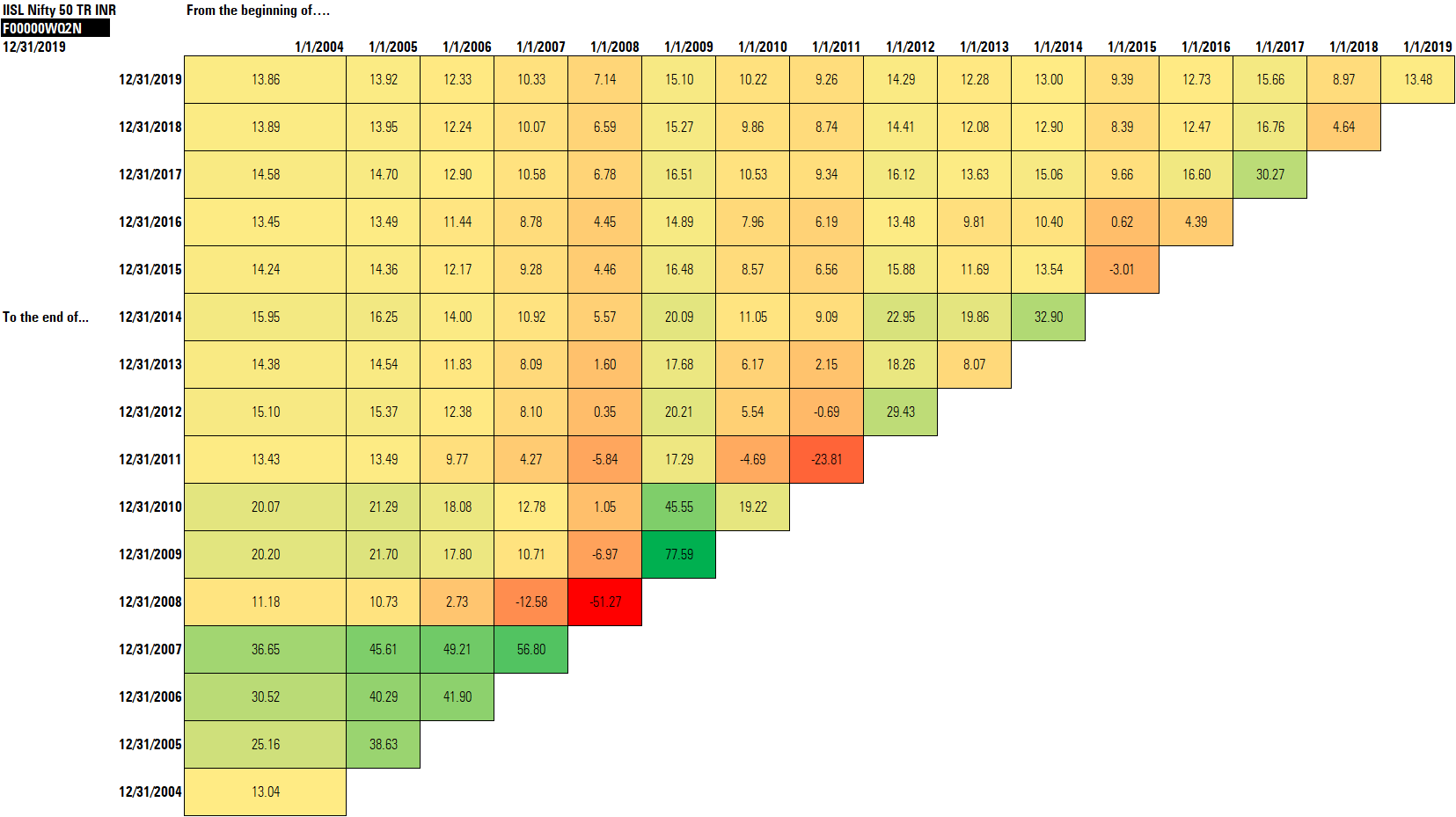 Observe the return over varying time periods. As the holding period increases, the range of return narrows, but there is a greater probability of positive returns.