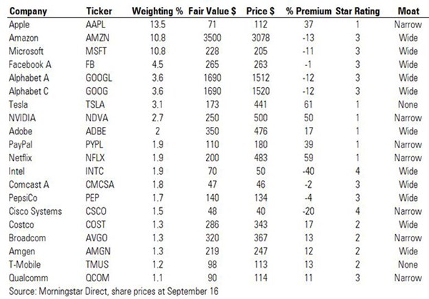 Tesla has benefited from momentum trading and a dramatic re-rating of the company’s prospects which has pushed shares into the stratosphere this year and sparked a stock split, which occurred on the same day as Apple's. Morningstar analysts assign a fair value of $173 to a Tesla share, but it is currently trading at a 61% premium to this at $449. Of the Nasdaq 20, it’s by far the most overvalued, according to Morningstar metrics.