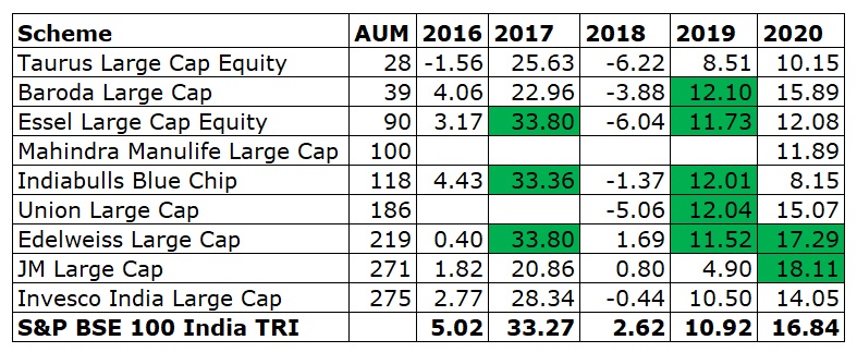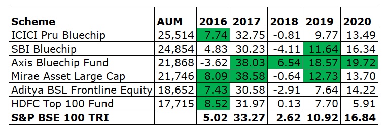 In calendar year 2020, the S&P BSE 100 delivered 16.84% return. During the same period, only six funds were able to beat this benchmark.