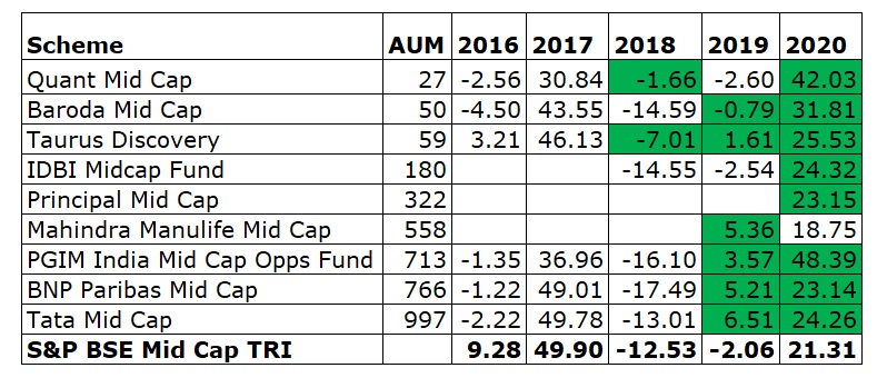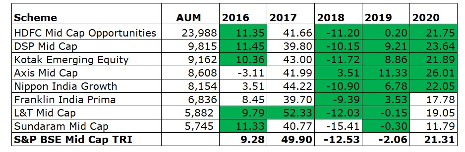 In CY2020, the S&P BSE Mid Cap delivered 21.31% return. Of 28 funds in this category, 18 funds outperformed the benchmark.