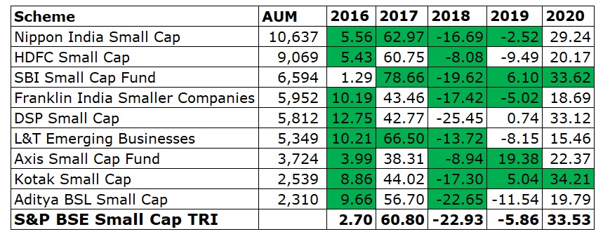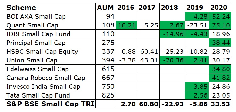 Of 21 small cap funds, only seven funds outperformed the S&P BSE Small Cap Index in CY2020. Of the seven funds which outperformed, five funds had AUM below Rs 700 crore. SBI Small Cap, with AUM of Rs 6,594 crore, was the only fund among the large sized funds, which outperformed the index.