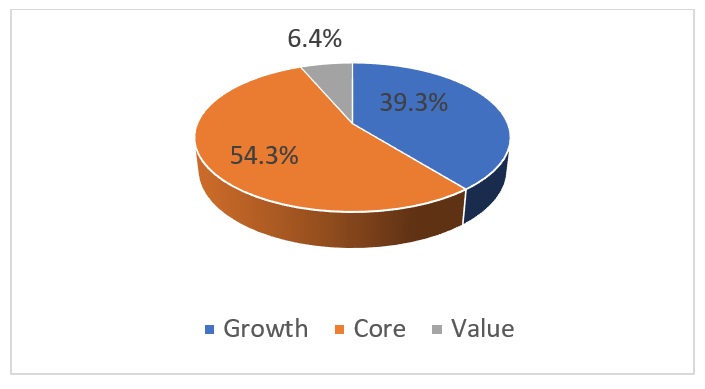 - The portfolio has a significant tilt towards growth and core stocks, but value is under owned. This skew is primarily due to the choice of funds. The investment mandate of most funds in the portfolio is tilted towards Growth and Growth at Reasonable Price (GARP) investing.