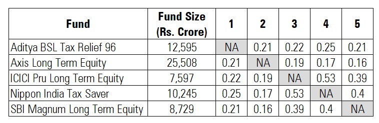 From the above table, you can see that Aditya BSL Tax Relief 96 and Axis Long Term Equity have 21% common holding. Similarly, Aditya BSL Tax Relief 96 and ICICI Prudential Long Term Equity Fund have 22% overlap of stocks. ABSL Tax Relief 96 has 25% overlap with Nippon India Tax Saver. One should select a fund that has a low overlap with another fund.