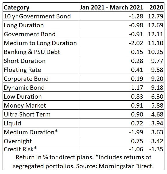 Here’s a look at the returns over calendar year 2020, and the first quarter of 2021 (January 1 – March 31). Over the last three months, constant maturity gilt funds, which invest in 10-year G-Secs, have yielded negative -1.28%. Last year, this very same category delivered 12.79%.