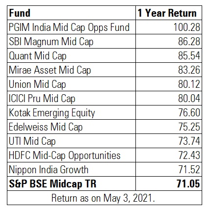 In the mid cap space, 11 funds have outperformed the S&P BSE Mid Cap TR Index over a one-year period, as on May 3, 2021. The mid cap category has delivered 70.16% during the same period. PGIM India Mid Cap topped the chart with 100.28% return during the same period.