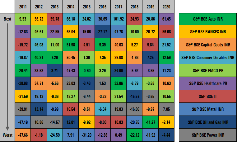 Investing in sectoral funds can be fraught with risk. As you can see from the above table, no single sector performs consistently well every year. For instance, S&P BSE IT Index delivered the highest return in 2018. In 2019, the best performing index was S&P BSE Consumer Durables. In 2020, S&P BSE Healthcare Index Price Return Index delivered the highest return at 61.45%. On the other hand, S&P BSE Oil and Gas Index delivered negative -4.44% in 2020. Thus, the fortunes of sector funds entirely depend on the fund mandate.