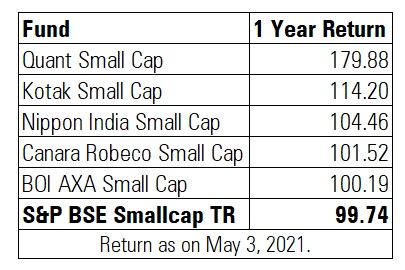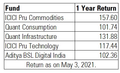 Let’s take a look at funds that delivered over 100% return over a one year trailing period as on May 3, 2021.