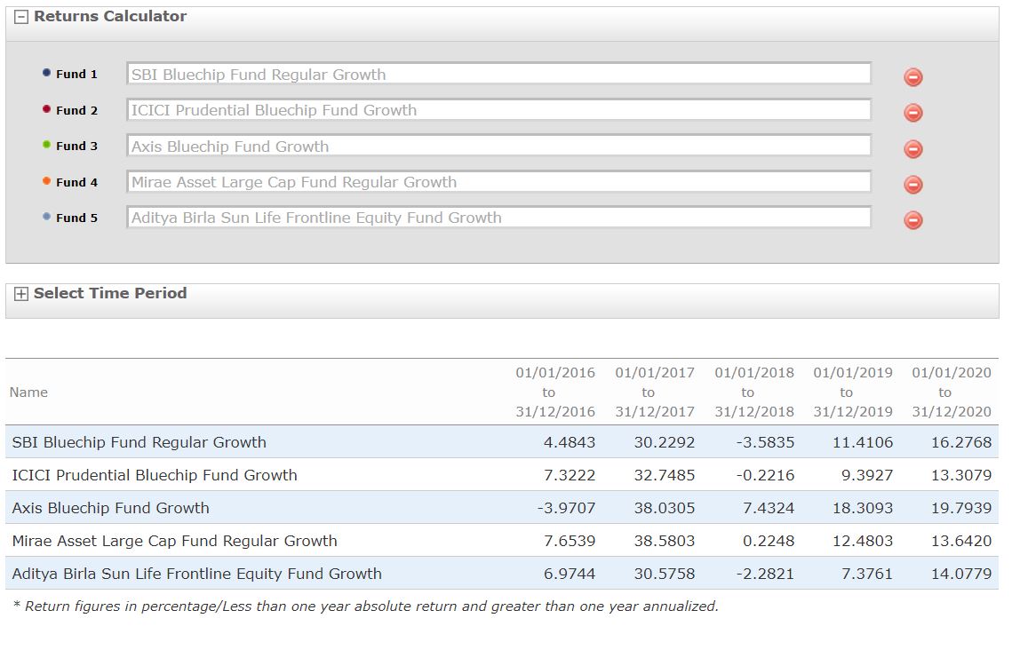 Type in the fund name in the Fund Tab. The search tab will list down the funds. Select the scheme of your choice by hitting enter tab on your keyboard or through the cursor. You can add up to five schemes. In the Select Time Period option, select the start and end time period of your choice. In this example, we have filtered the five largest funds in the Large Cap category calendar year wise since 2016. You can choose a start and end date of your choice. It can be monthly, weekly, one day, one week, one year or since the fund’s inception.