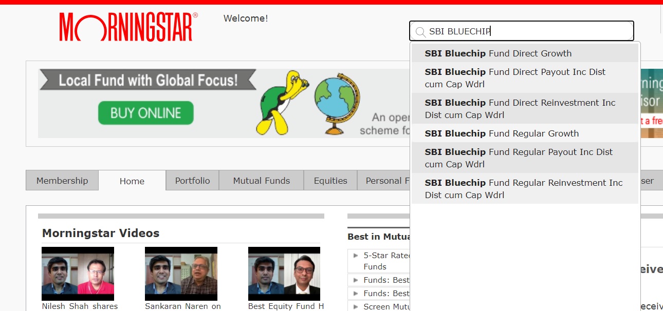 If you wish to look at the performance of a single fund, you can alternatively search on the homepage of Morningstar.in search tab as shown below.