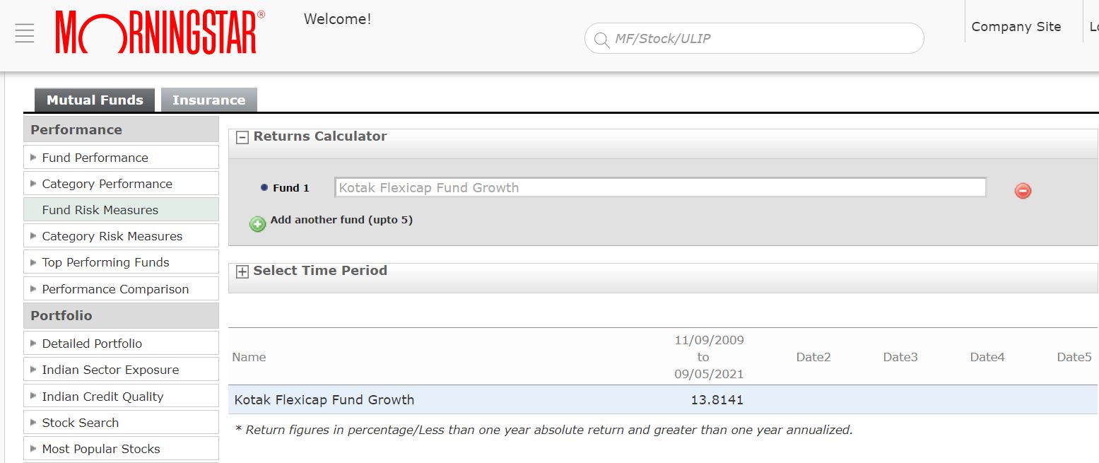 Here is the since inception return of Kotak Flexi Cap Fund. The fund was launched on September 11, 2009. The result shows that the fund has delivered 13.81% compounded annual growth rate (CAGR) since inception as on May 7, 2021. In this example, we have chosen only one fund. You can choose up to five funds.