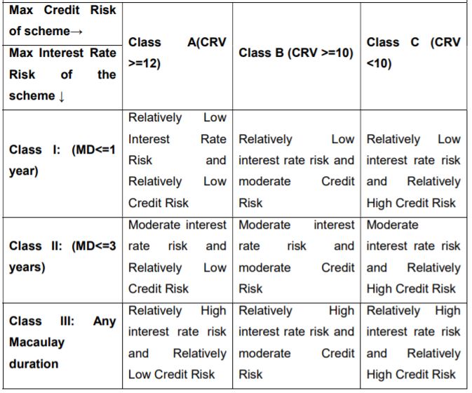 Interest rate risk is measured by the Macaulay Duration of the scheme while Credit Risk will de be denoted by Credit Risk Value (CRV). The schemes will be placed in a nine-grid box which will denote the Potential Risk Class matrix (PRC).
