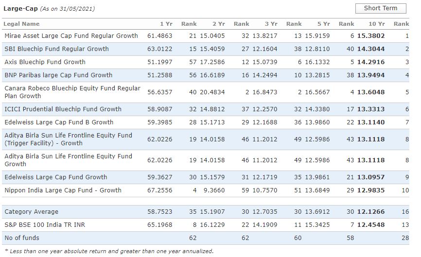 We looked at the ten top-performing funds in the large-cap category over a ten-year period. There are 28 funds that existed over a ten-year time frame. Over this period, Mirae Asset Large Cap has been the top performer with 15.38% Compound Annual Growth Rate (CAGR) while the category average delivered 12.12% as on May 31, 2021. The benchmark BSE 100 delivered 12.45% over ten year period as on May 31, 2021.