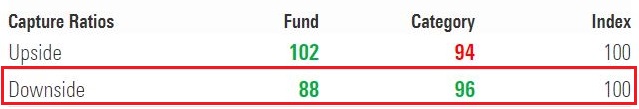 A downside capture ratio of less than 100 indicates that a fund has lost less than its benchmark in periods when the benchmark has been in the red. Over a ten-year period as of May 2021, the downside capture ratio of Mirae Asset Large Cap Fund is 88, which means the fund has captured 88% of the downside and protected the portfolio by 12% when the benchmark fell.